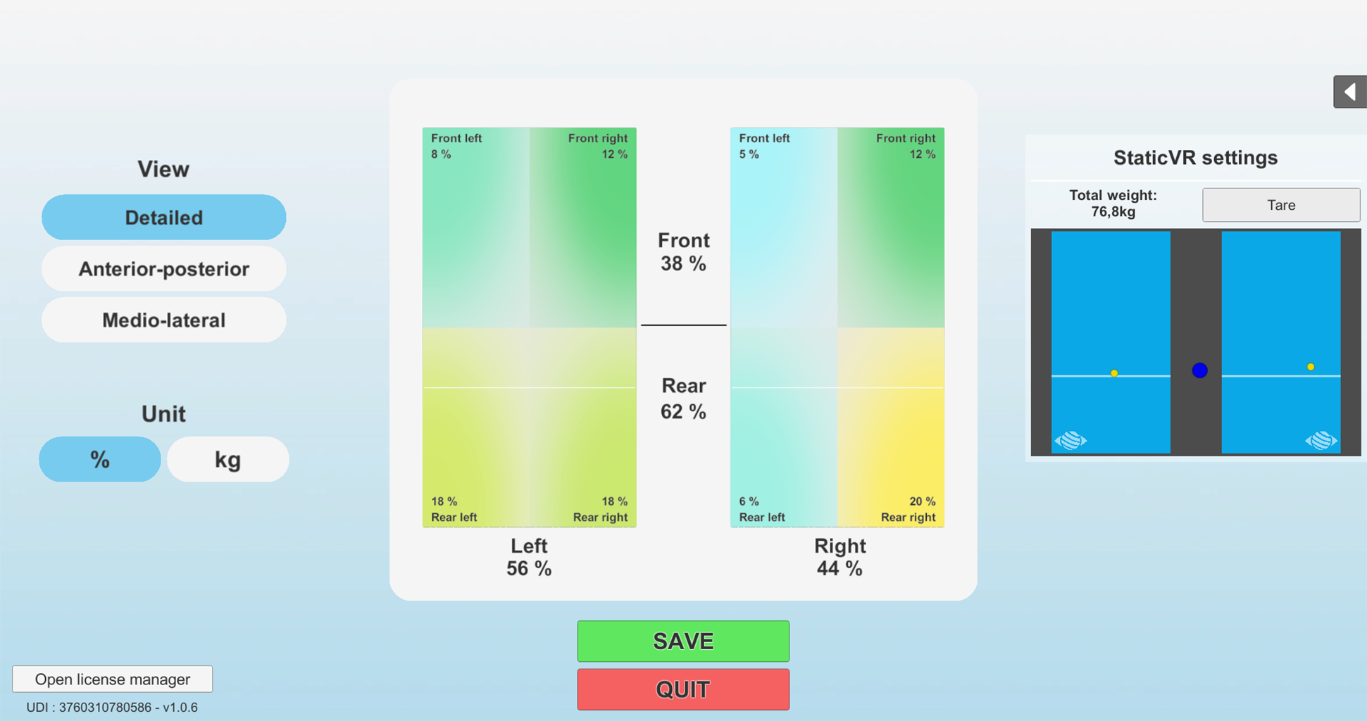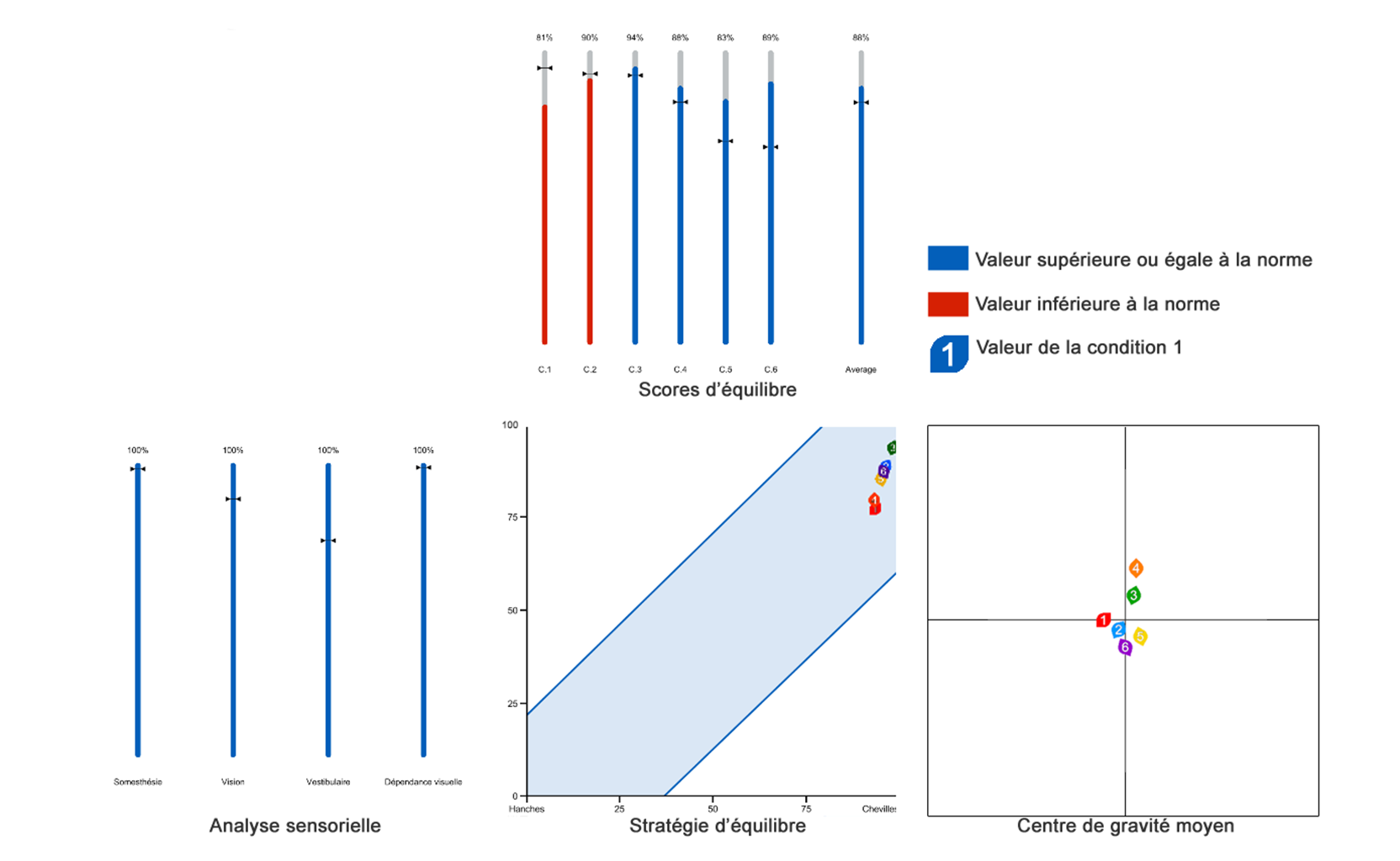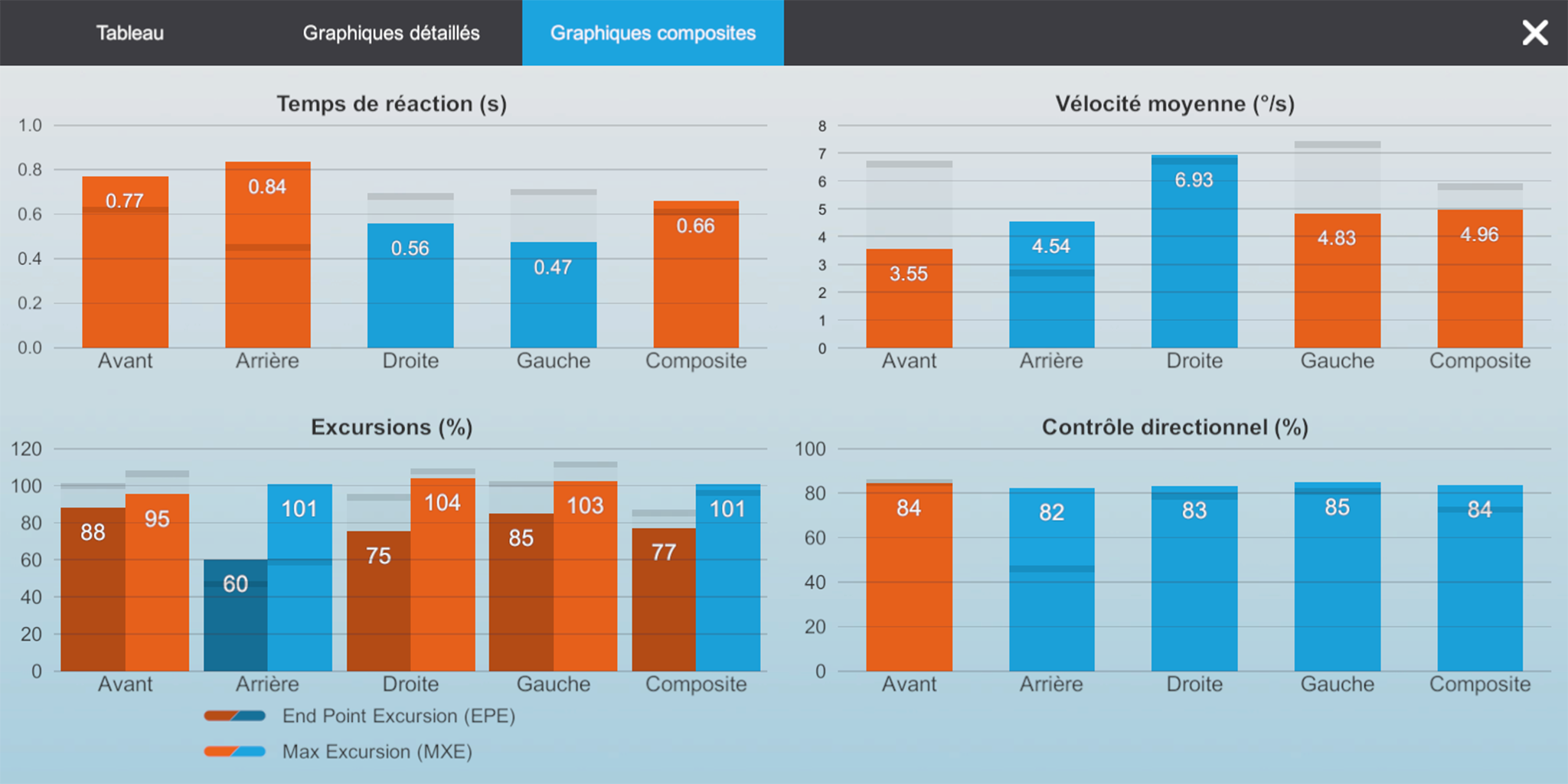Različne ocene: Test senzorične razporeditve (SOT), valovna analiza, polarna predstavitev gibanja, porazdelitev teže, meje stabilnosti (amplituda, natančnost, čas odziva)